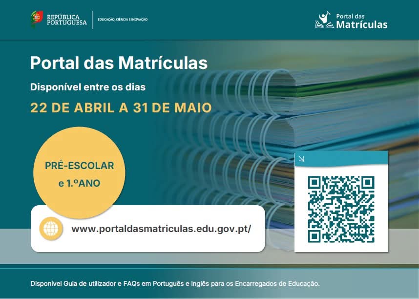 Prazo de matrículas Pré-Escolar e 1.º ano (22 de abril a 31 de maio de 2025)